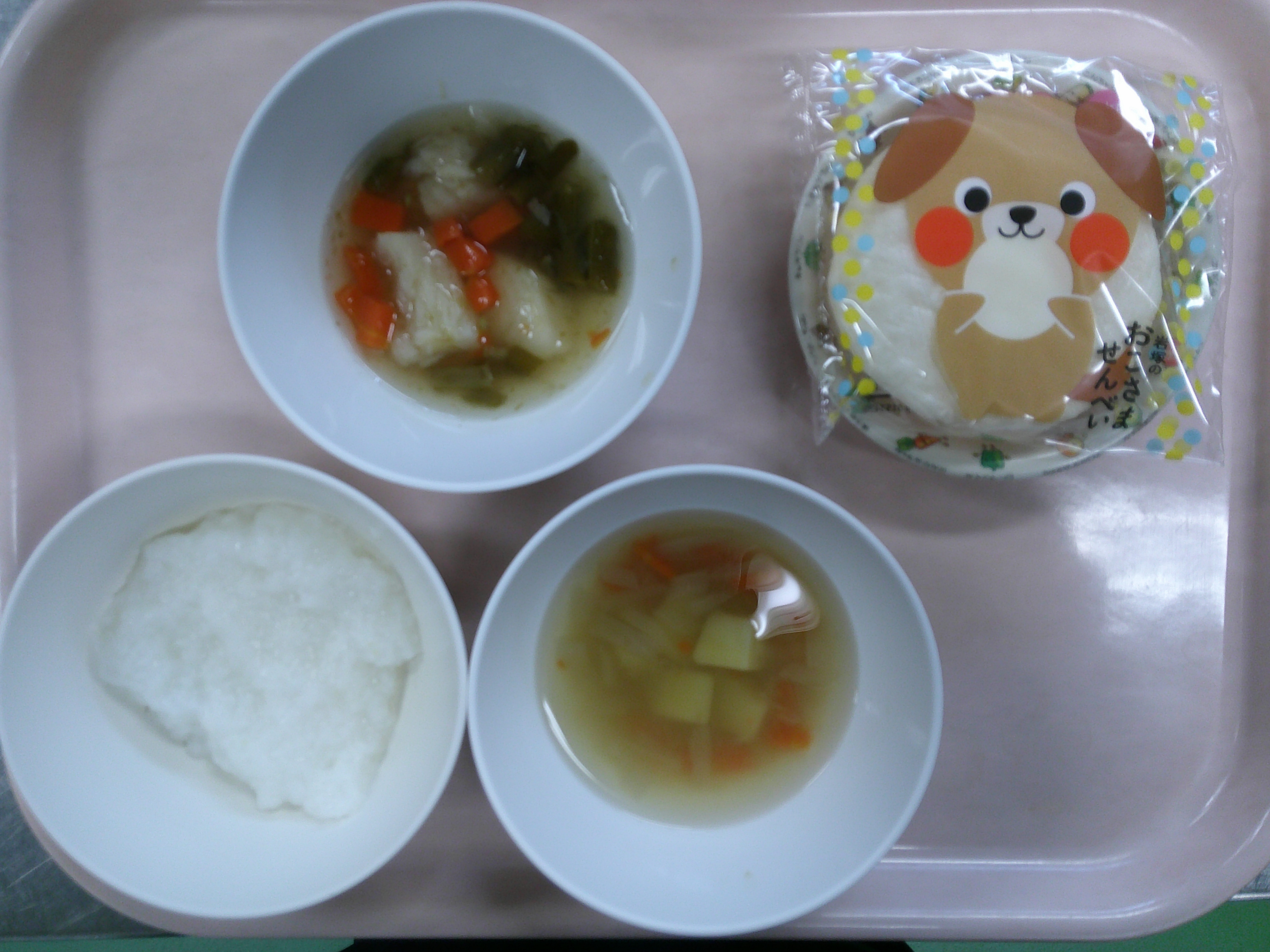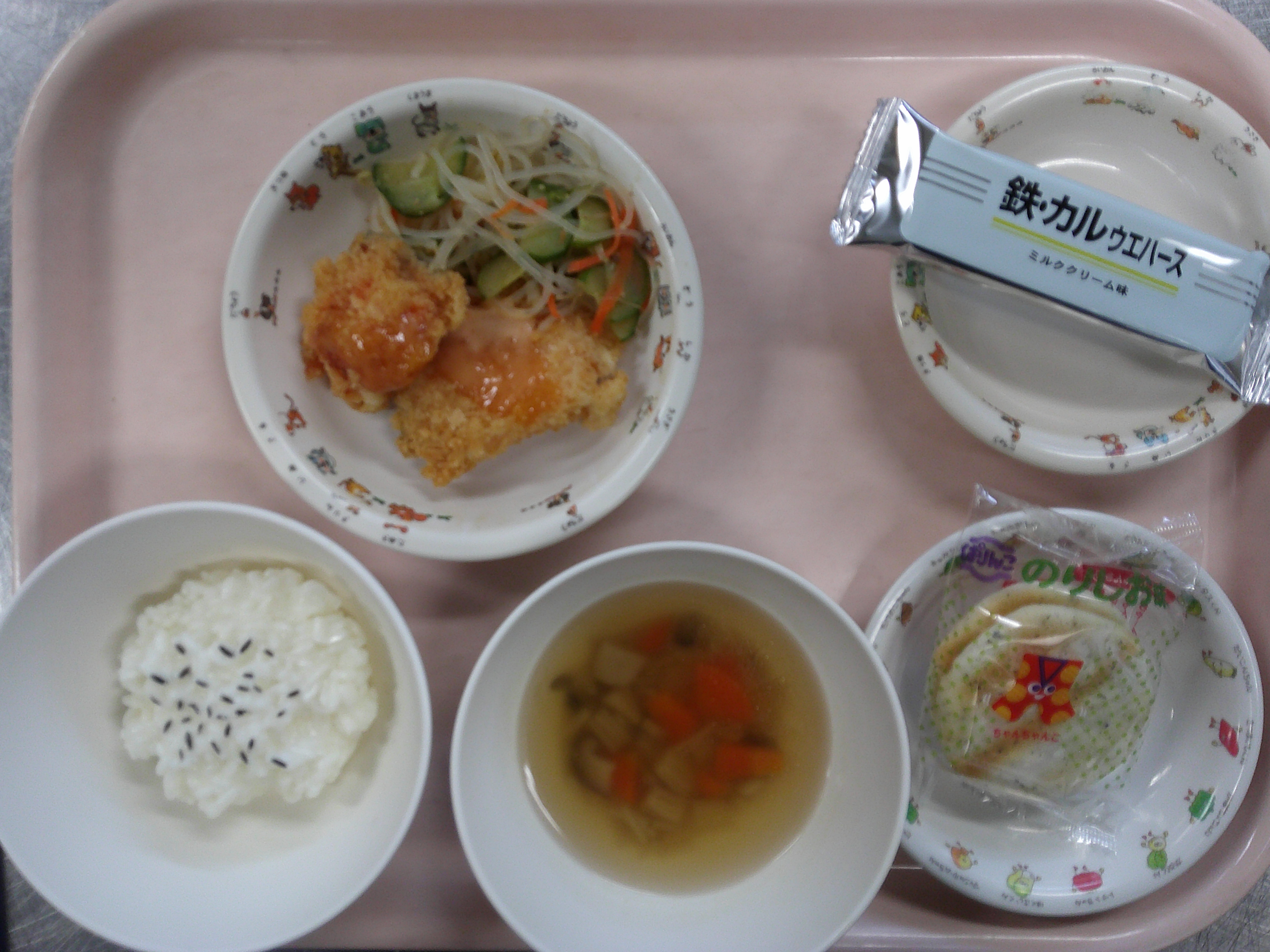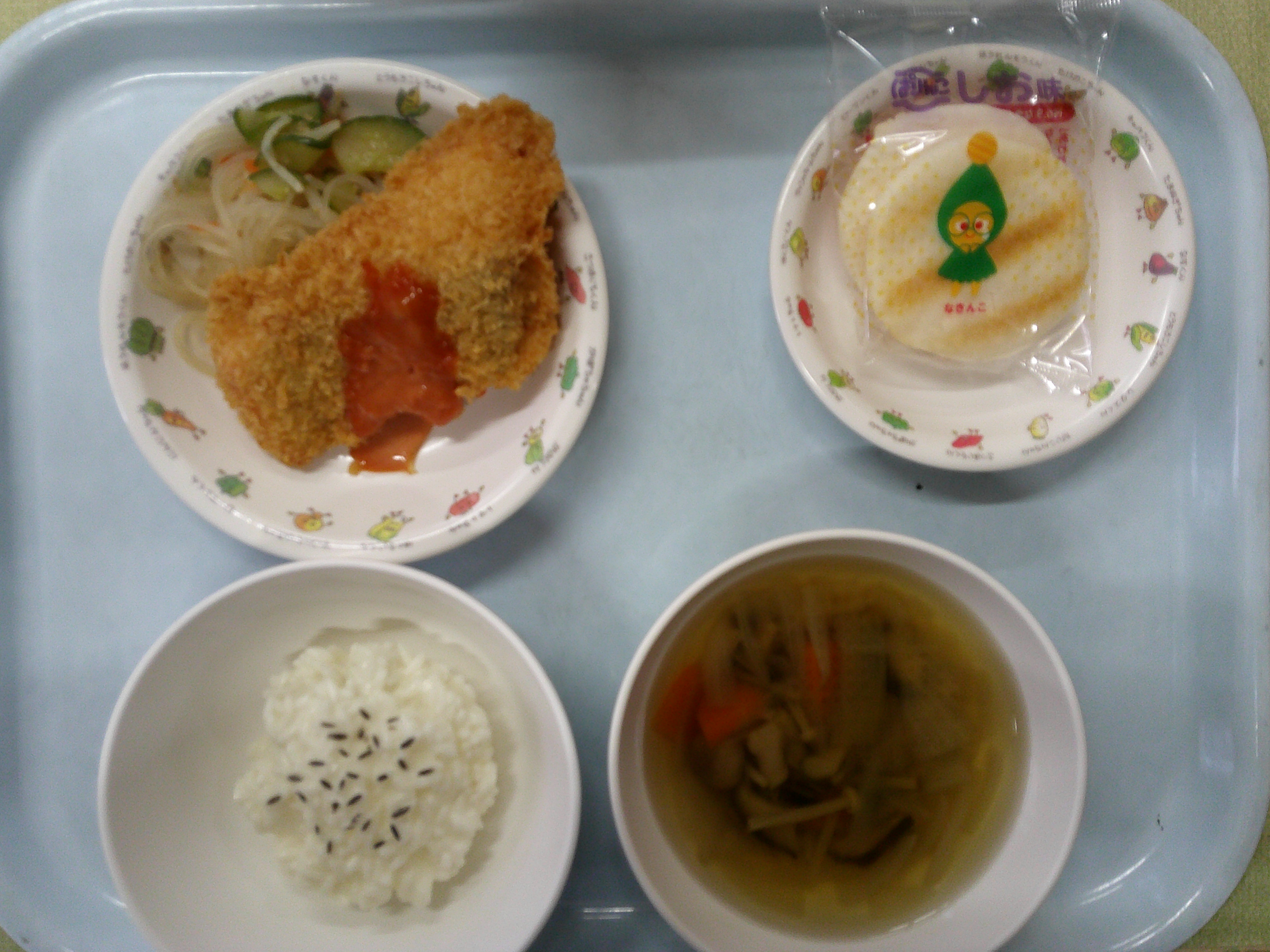12月1日の献立 ~以上児本日の献立~ ・鮭フライ ・ごま酢和え ・きのこスープ *せんべい、牛乳(午後のおやつ) ~未満児本日の献立~ ・ごはん ・鮭フライ ・ごま酢和え ・きのこスープ *ウエハース、お茶 *せんべい、牛乳(午後のおやつ)~後期食本日の献立~ ・おかゆ ・魚の野菜あんかけ ・味噌汁 *せんべい ~中期食本日の献立~ ・本日配食なし ・ ・