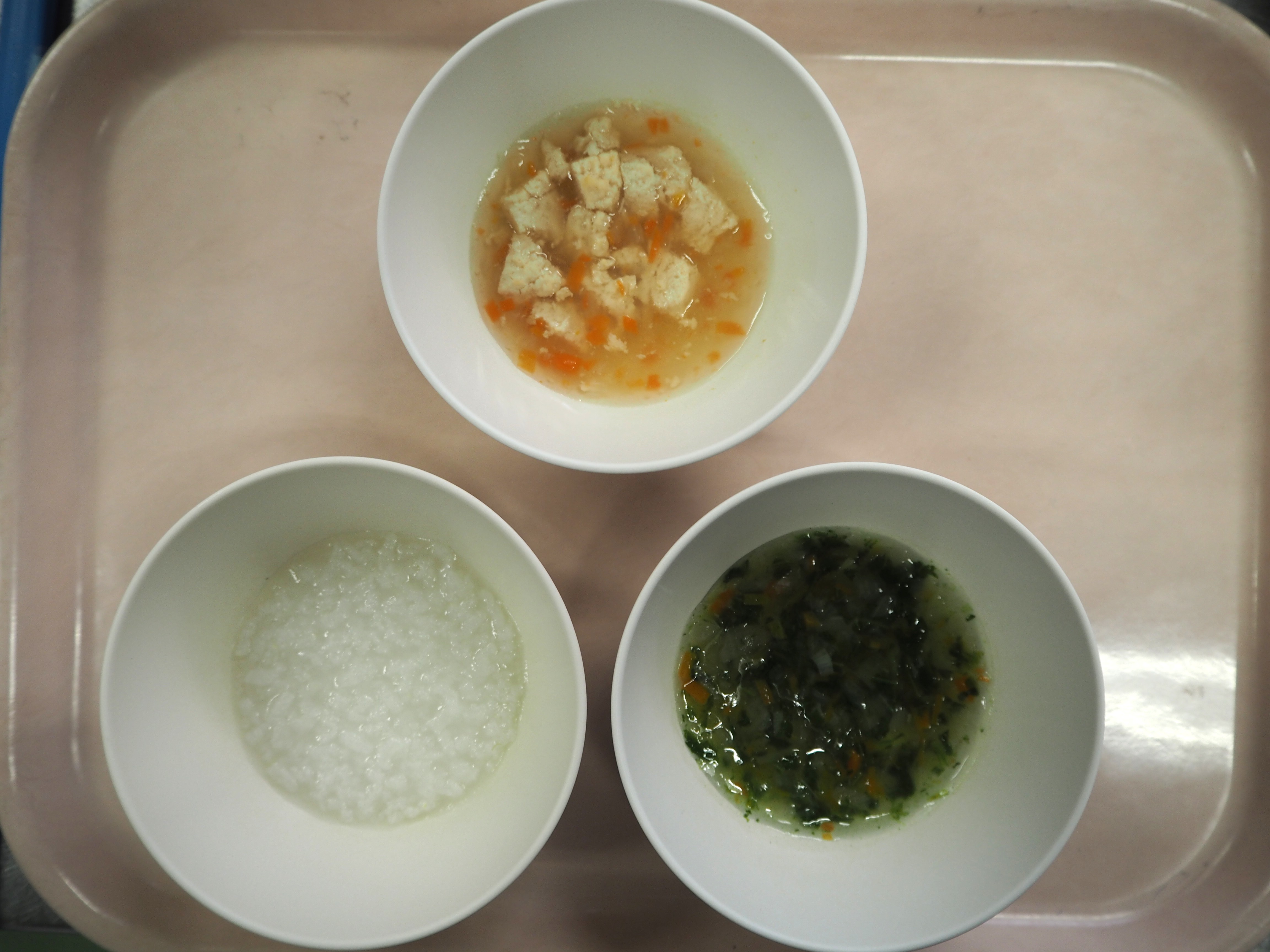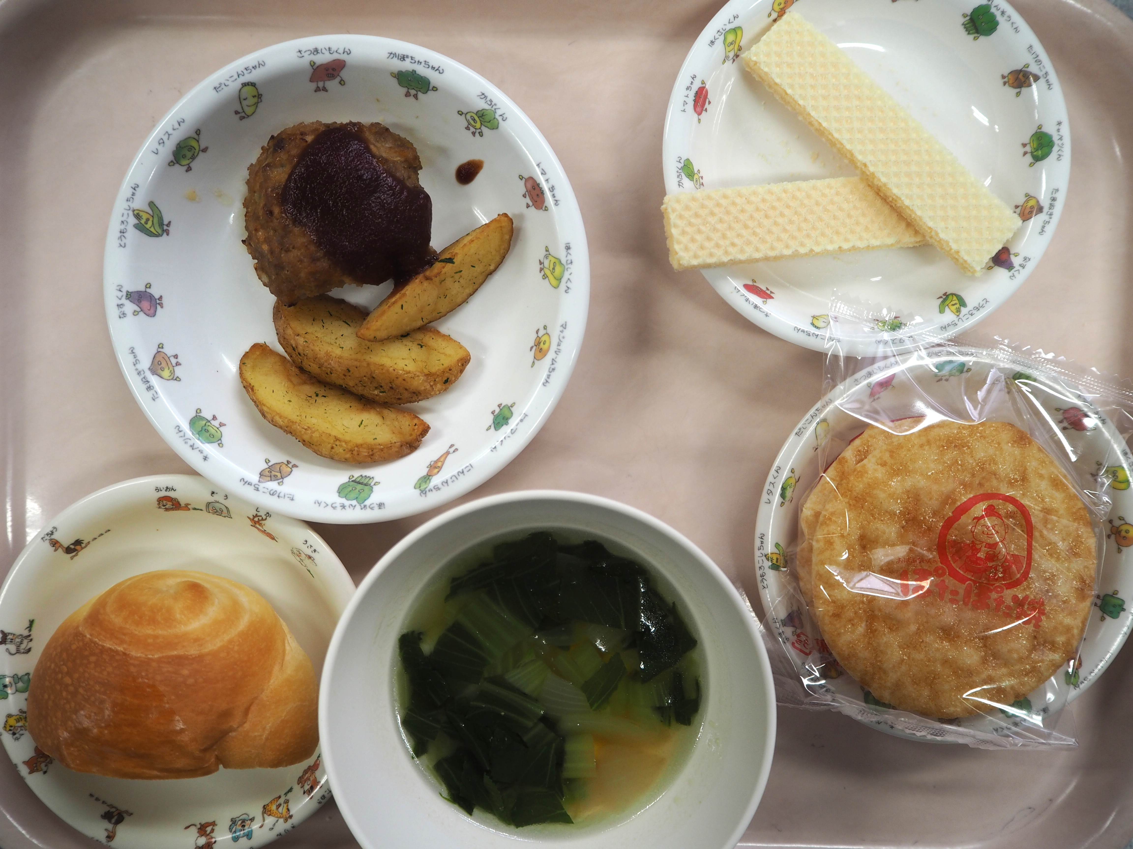 2月10日の献立 ~以上児本日の献立~ ・豆腐ハンバーグ ・フライドポテト ・チンゲン菜のスープ *せんべい、牛乳(午後のおやつ) ~未満児本日の献立~ ・パン ・豆腐ハンバーグ ・フライドポテト ・チンゲン菜のスープ *ウエハース、お茶 *せんべい、牛乳(午後のおやつ)~後期食本日の献立~ ・おかゆ ・ハンバーグ ・チンゲン菜のスープ *せんべい ~中期食本日の献立~ ・おかゆ ・ハンバーグ ・チンゲン菜のスープ