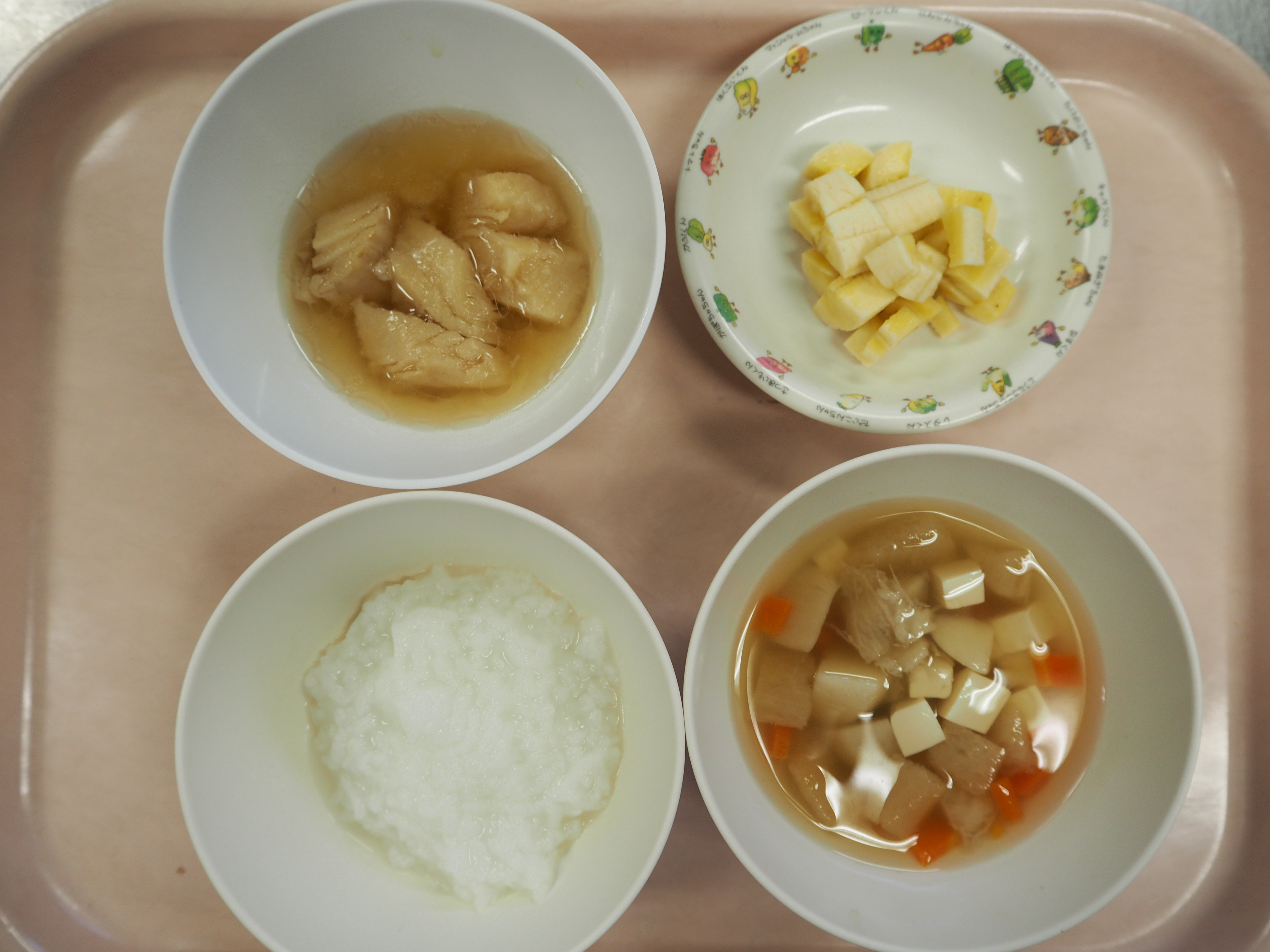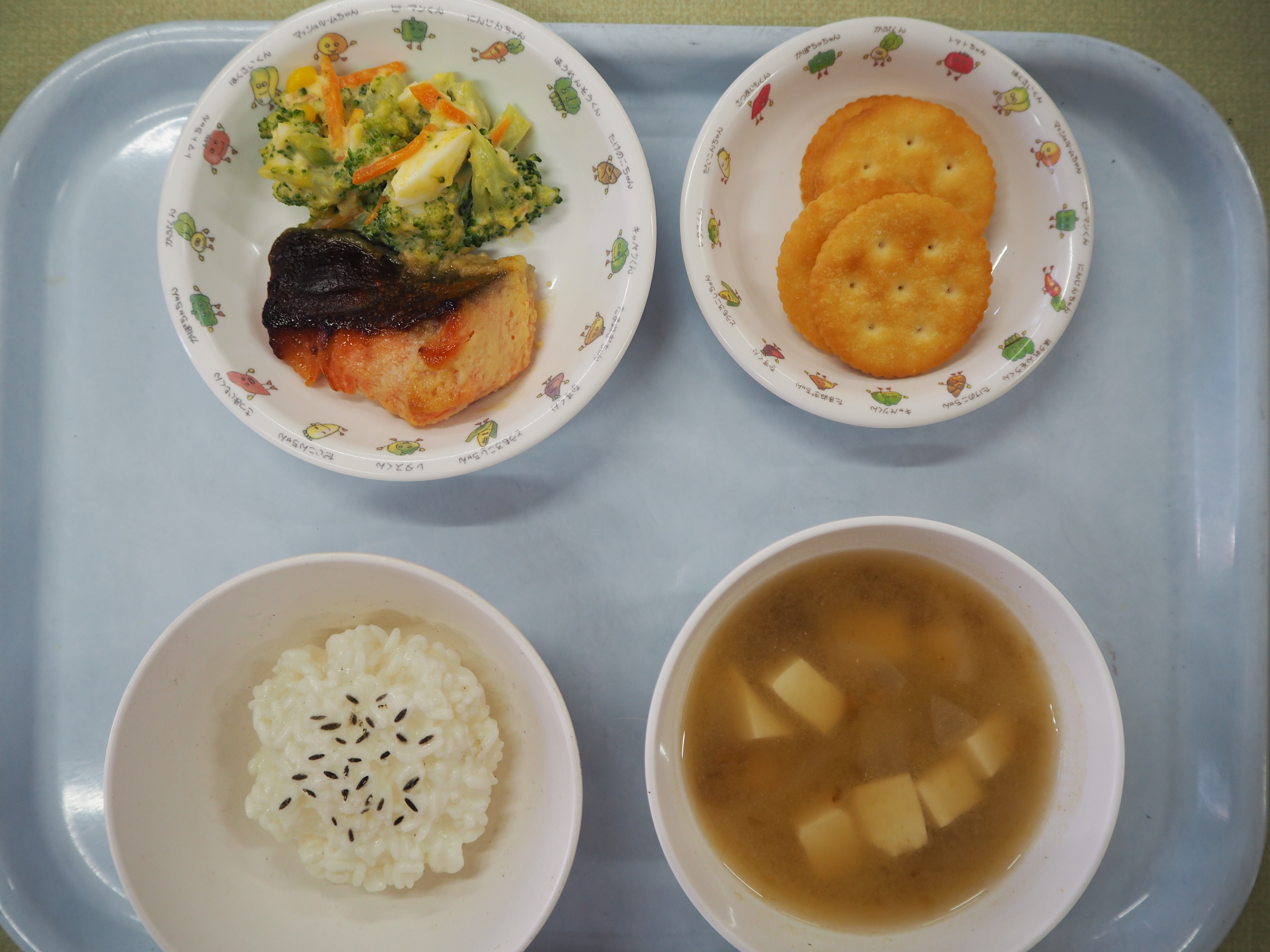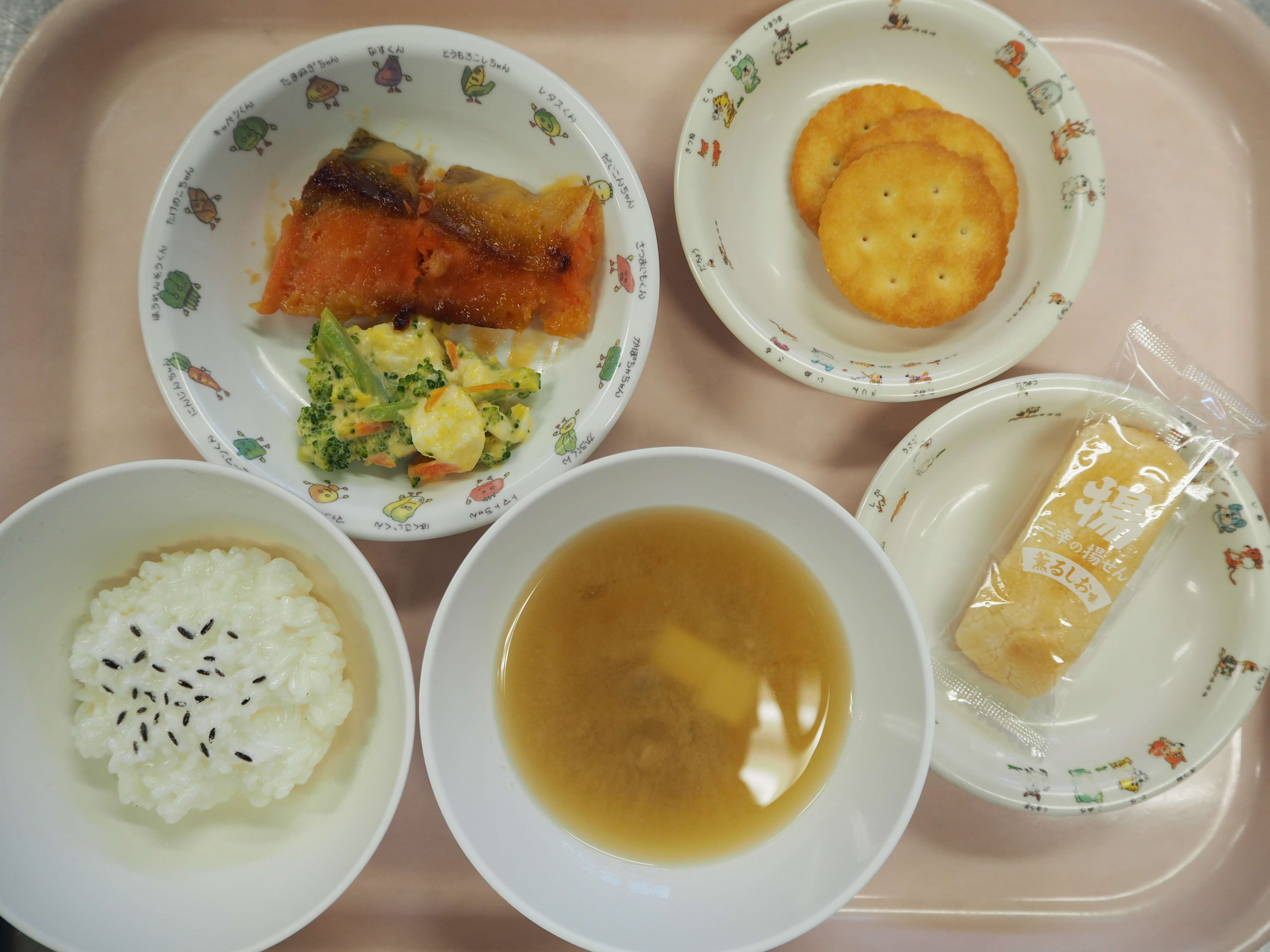 10月9日の献立 ~以上児本日の献立~ ・鮭の西京焼き ・ブロッコリーと卵のサラダ ・味噌汁 *クラッカー、牛乳(午後のおやつ) ~未満児本日の献立~ ・ごはん ・鮭の西京焼き ・ブロッコリーと卵のサラダ ・味噌汁 *せんべい、お茶 *クラッカー、牛乳(午後のおやつ)~後期食本日の献立~ ・おかゆ ・魚の味噌煮 ・すまし汁 *バナナ