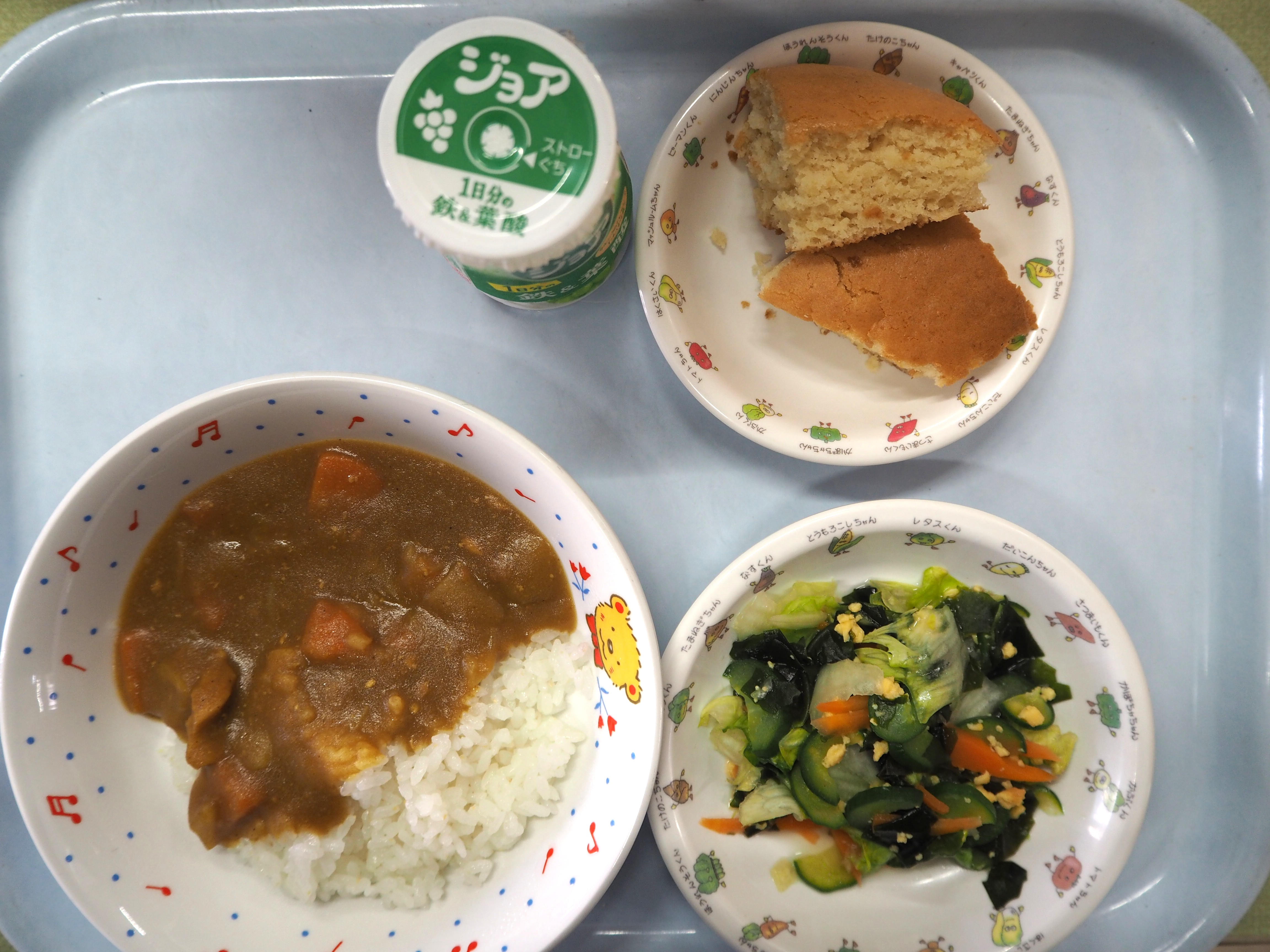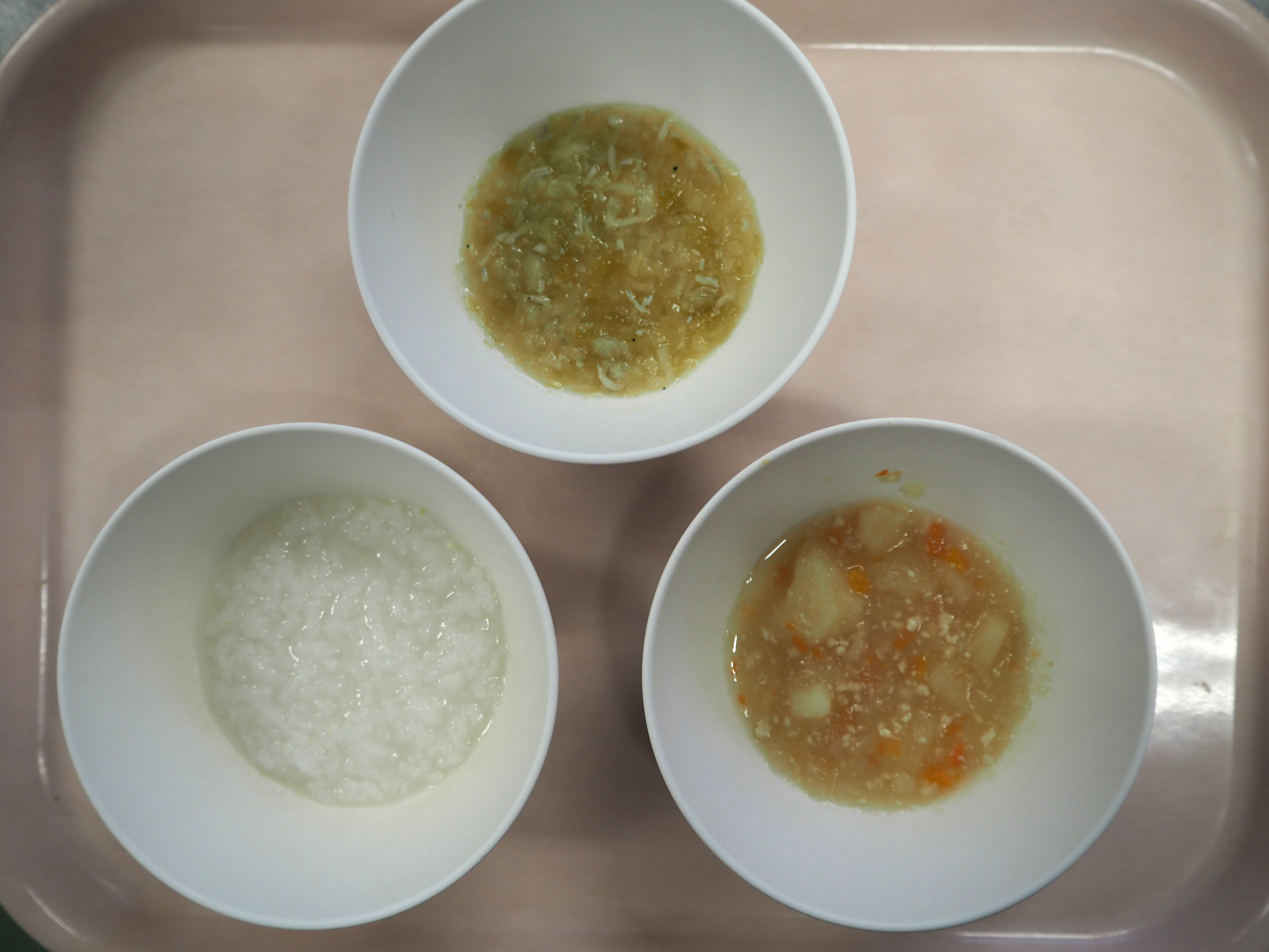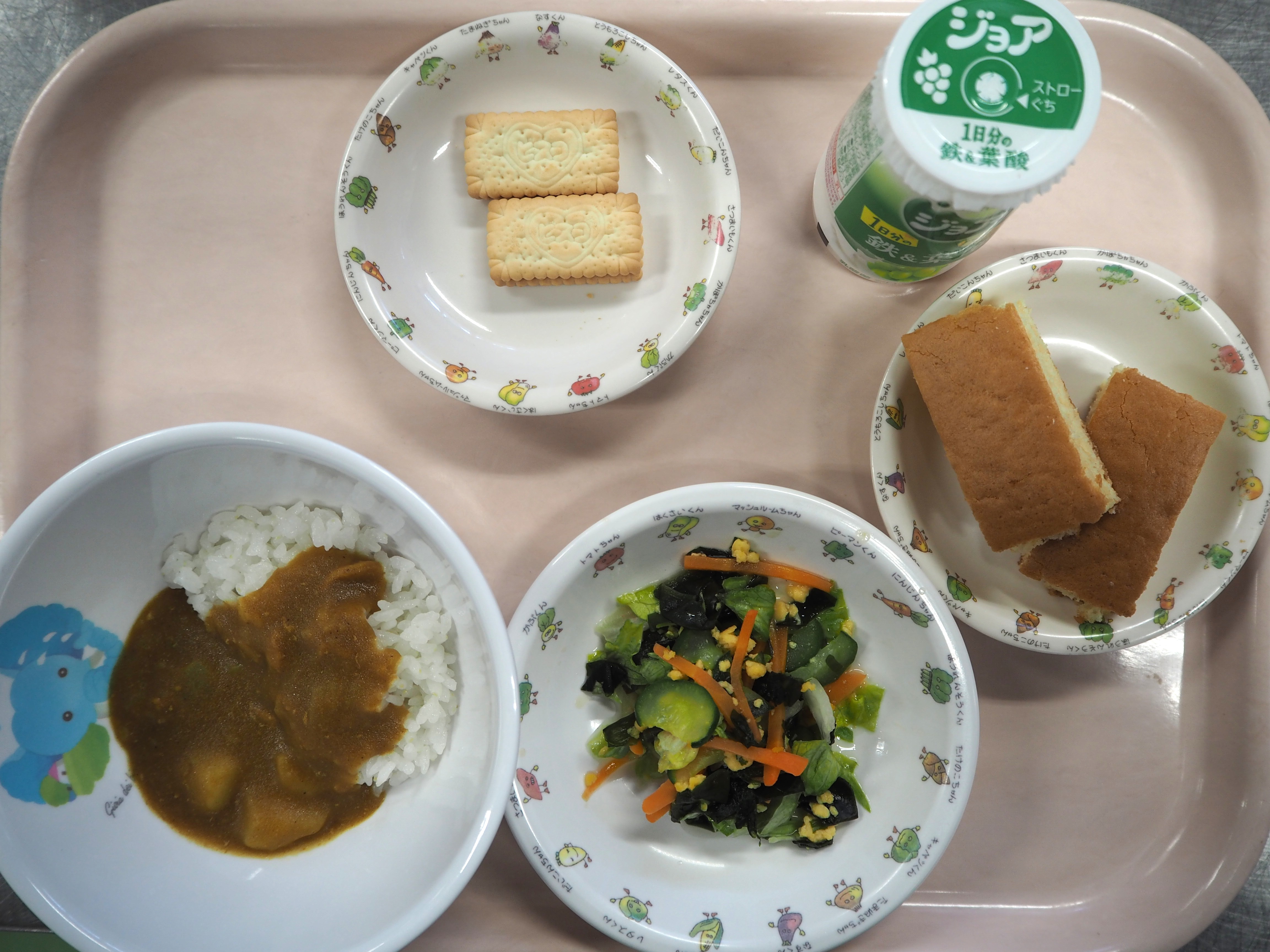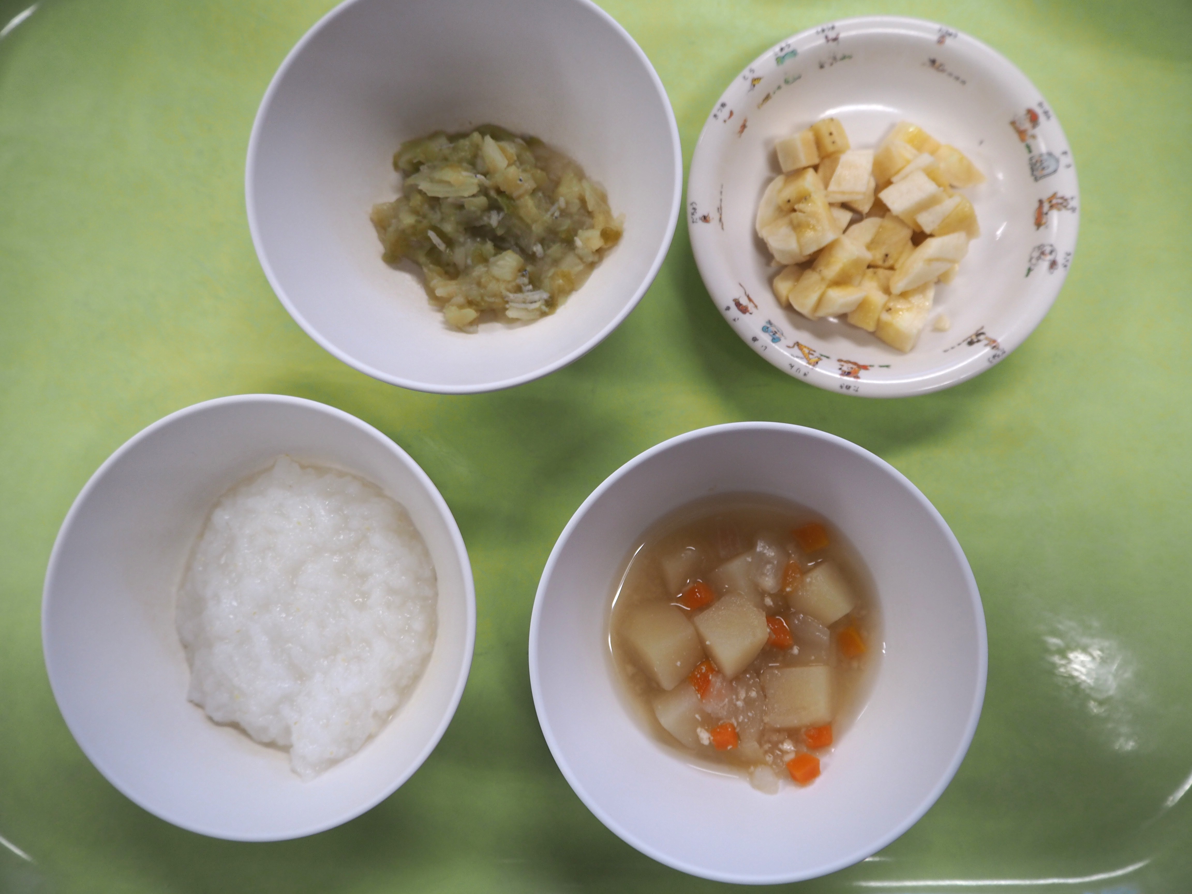 2月13日の献立 ~以上児本日の献立~ ・チキンカレー ・ドレッシングサラダ *ホットケーキ、乳酸飲料(午後のおやつ) ~未満児本日の献立~ ・チキンカレー ・ドレッシングサラダ *ビスケット、お茶 *ホットケーキ、乳酸飲料(午後のおやつ)~後期食本日の献立~ ・おかゆ ・ポトフ ・しらすサラダ *バナナ ~中期食本日の献立~ ・おかゆ ・ポトフ ・しらすサラダ