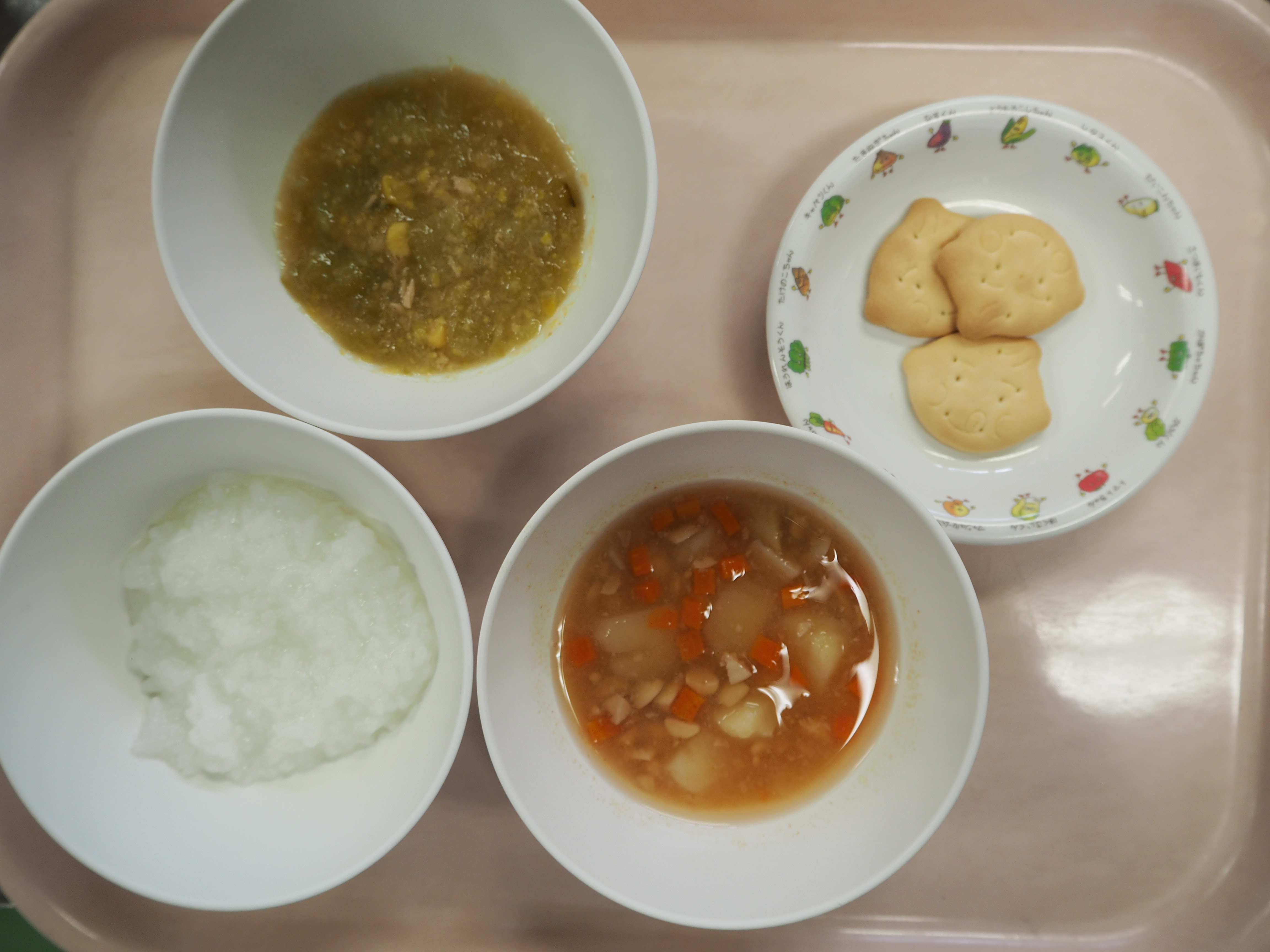 10月10日の献立 ~以上児本日の献立~ ・ポークビーンズ ・切り干し大根のごまマヨネーズ和え ・チーズ *ビスケット、乳酸飲料(午後のおやつ) ~未満児本日の献立~ ・ごはん ・ポークビーンズ ・切り干し大根のごまマヨネーズ和え ・チーズ *ヨーグルト、お茶 *ビスケット、乳酸飲料(午後のおやつ)~後期食本日の献立~ ・おかゆ ・豆とトマトのスープ ・コーンサラダ *ビスケット