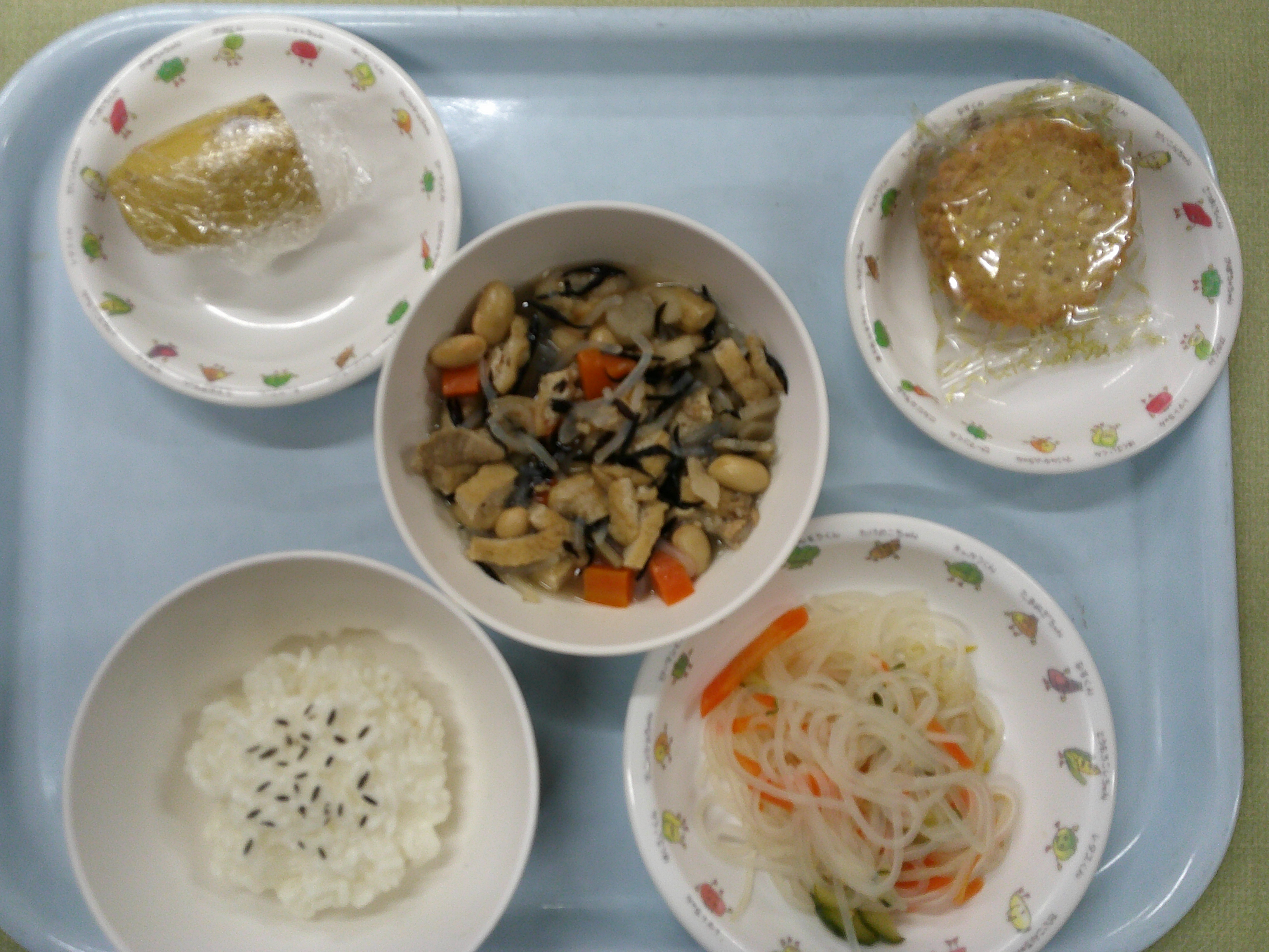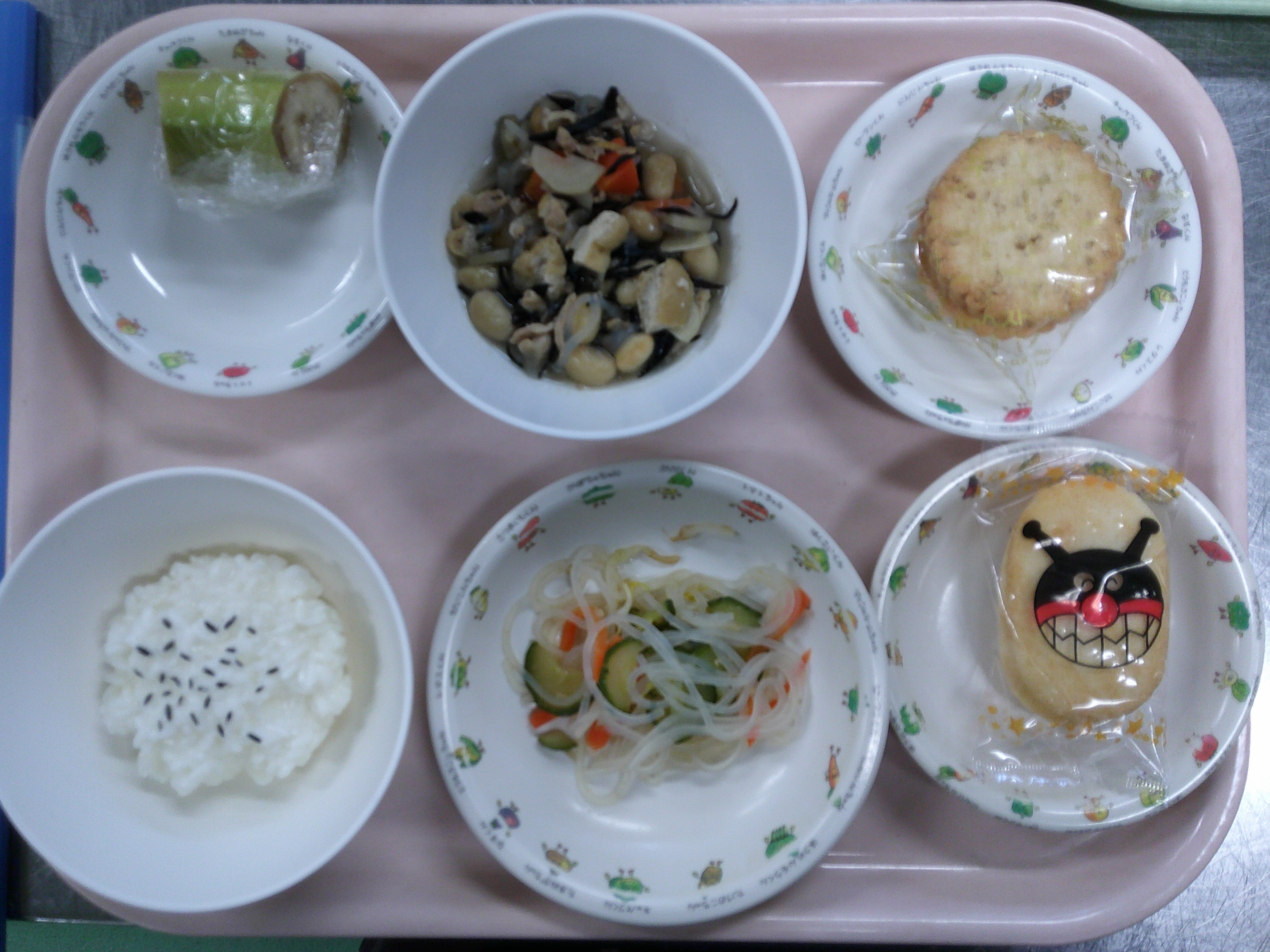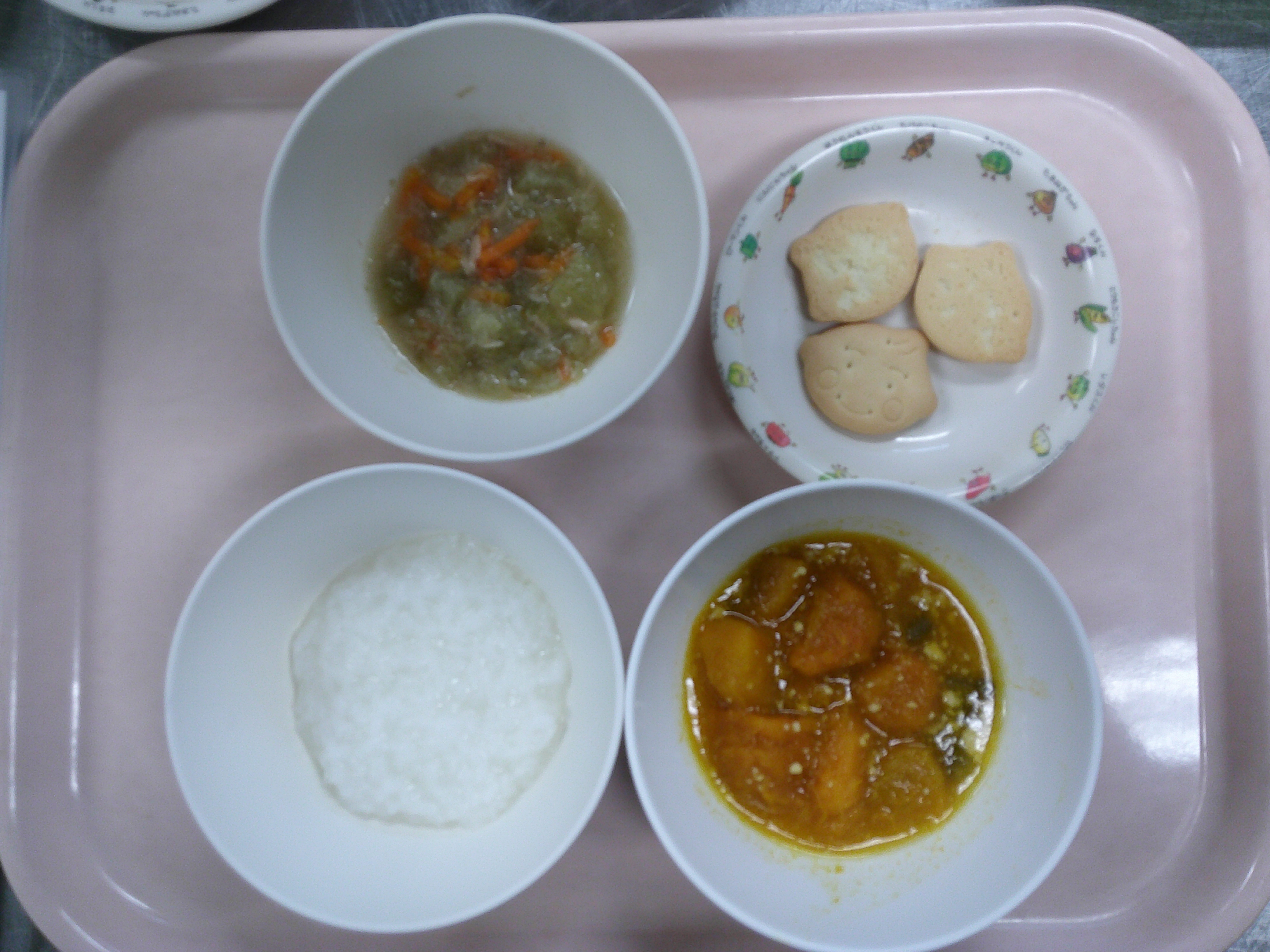 10月14日の献立 ~以上児本日の献立~ ・豚肉と大豆の磯煮 ・ごま酢和え ・バナナ *ビスケット、牛乳(午後のおやつ) ~未満児本日の献立~ ・ごはん ・豚肉と大豆の磯煮 ・ごま酢和え ・バナナ *せんべい、お茶 *ビスケット、牛乳(午後のおやつ)~後期食本日の献立~ ・おかゆ ・かぼちゃの煮物 ・きゅうりのサラダ *ビスケット