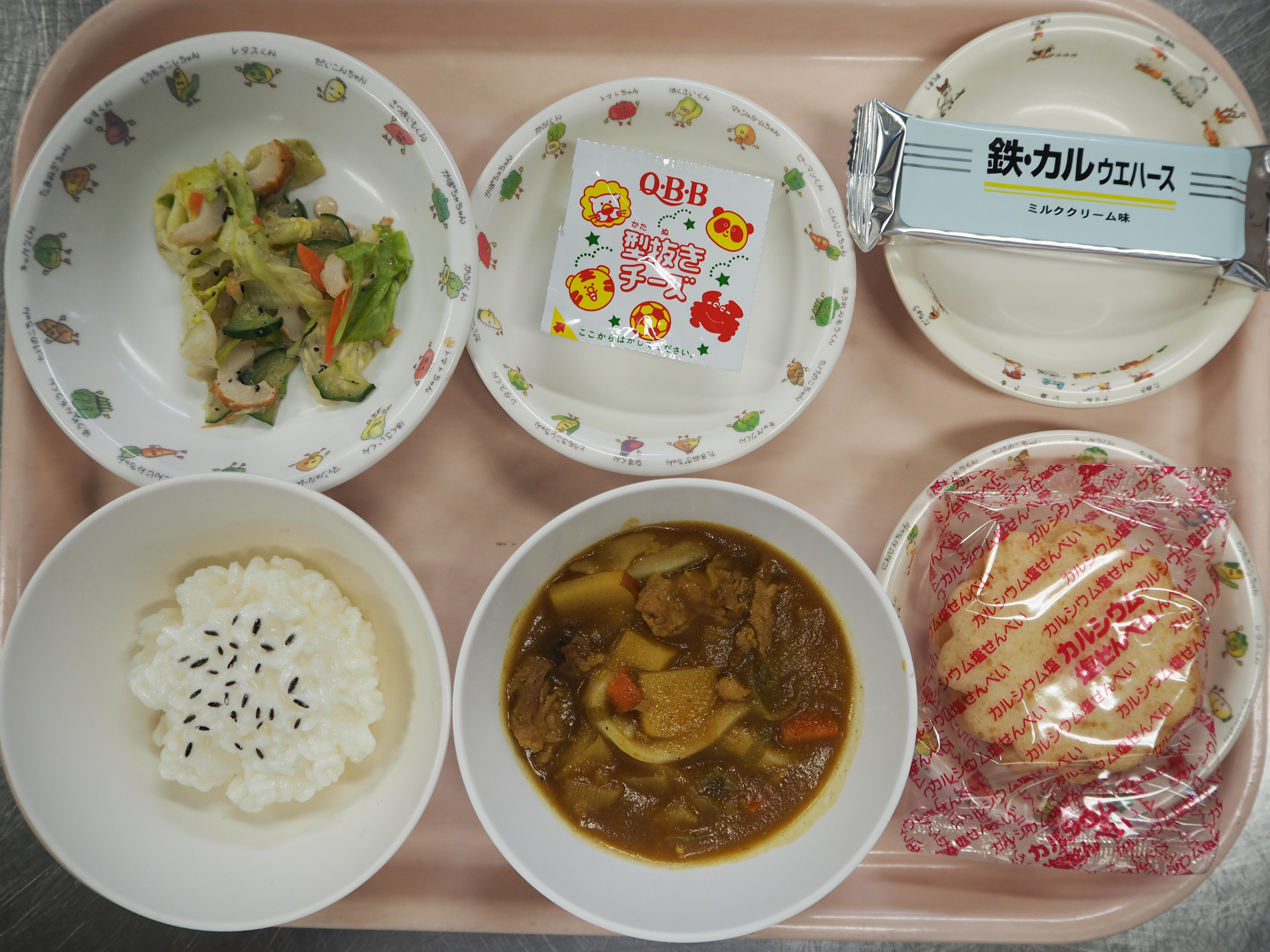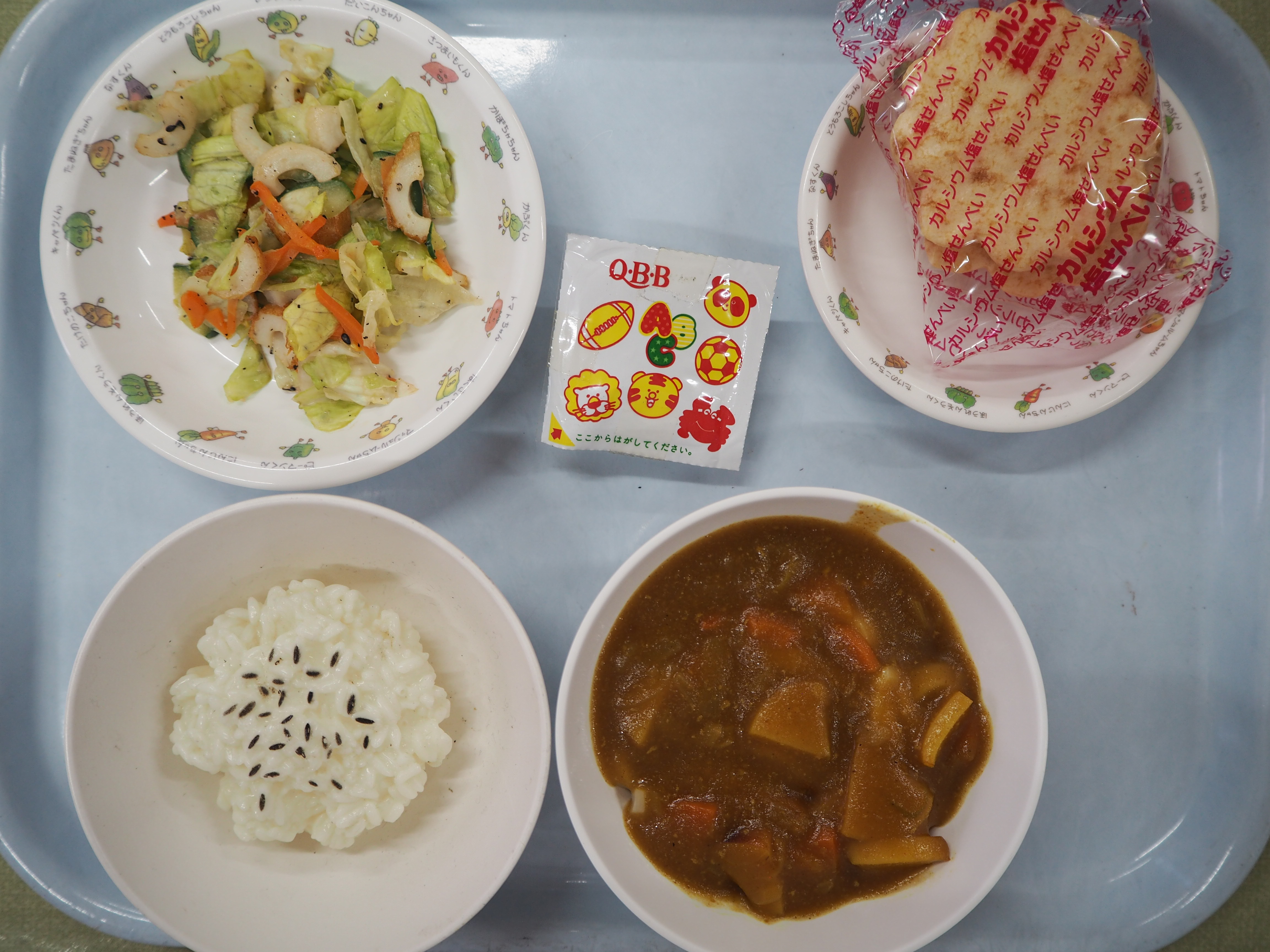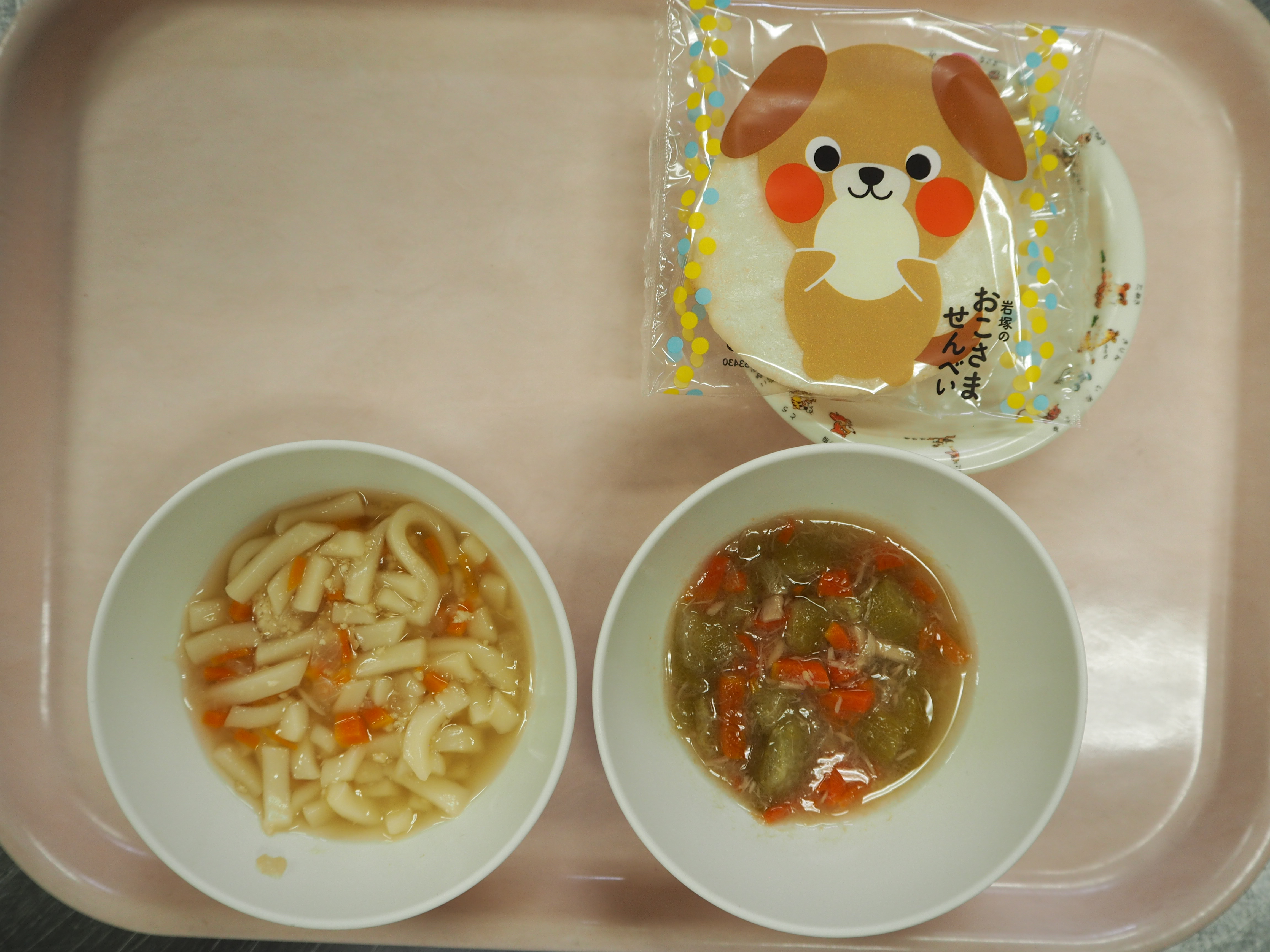 10月16日の献立 ~以上児本日の献立~ ・カレーうどん ・和風サラダ ・チーズ *せんべい、牛乳(午後のおやつ) ~未満児本日の献立~ ・ごはん ・カレーうどん ・和風サラダ ・チーズ *ウエハース、お茶 *せんべい、牛乳(午後のおやつ)~後期食本日の献立~ ・野菜うどん ・ツナサラダ *せんべい ~中期食本日の献立~ ・野菜うどん ・ツナサラダ