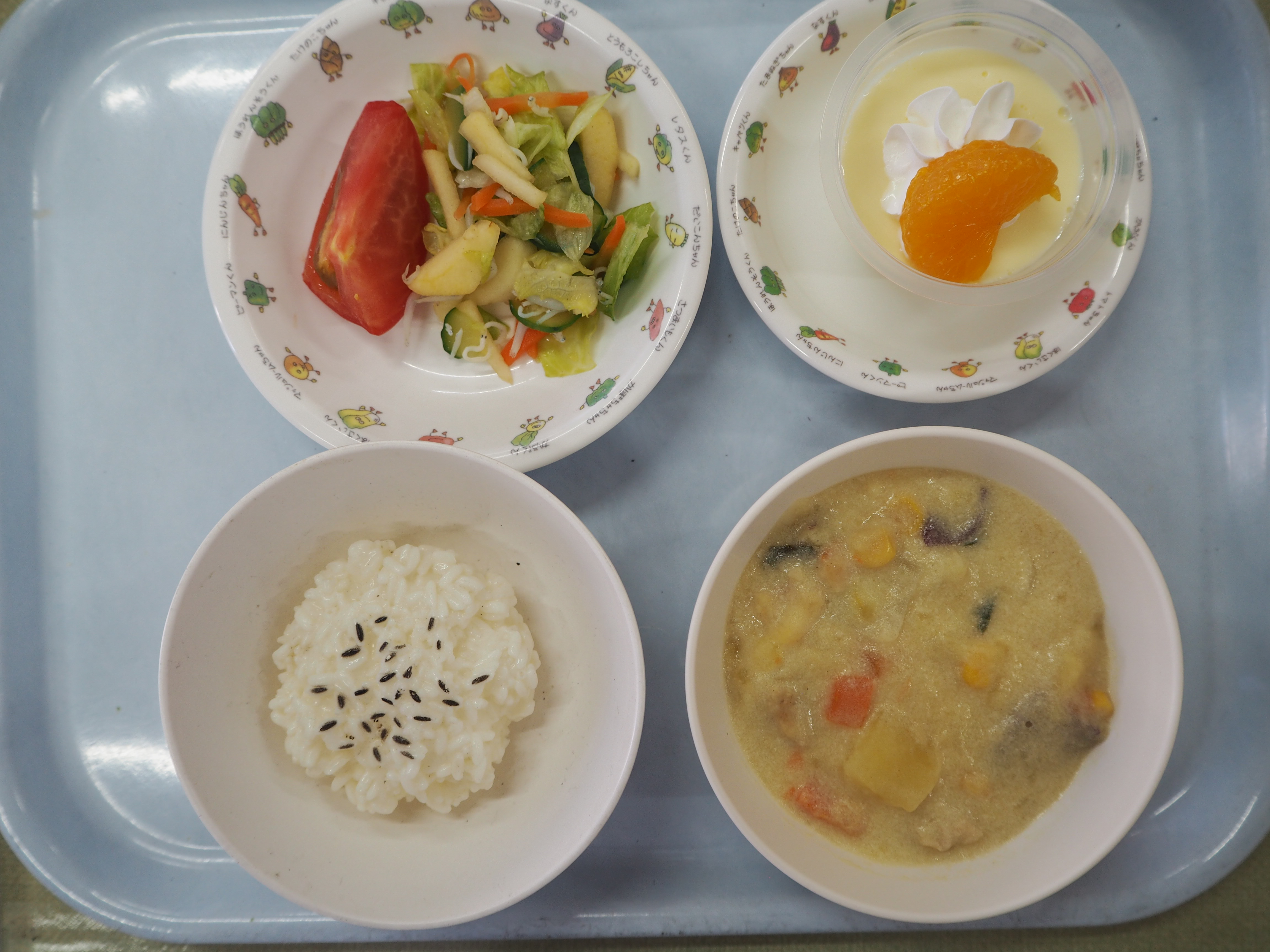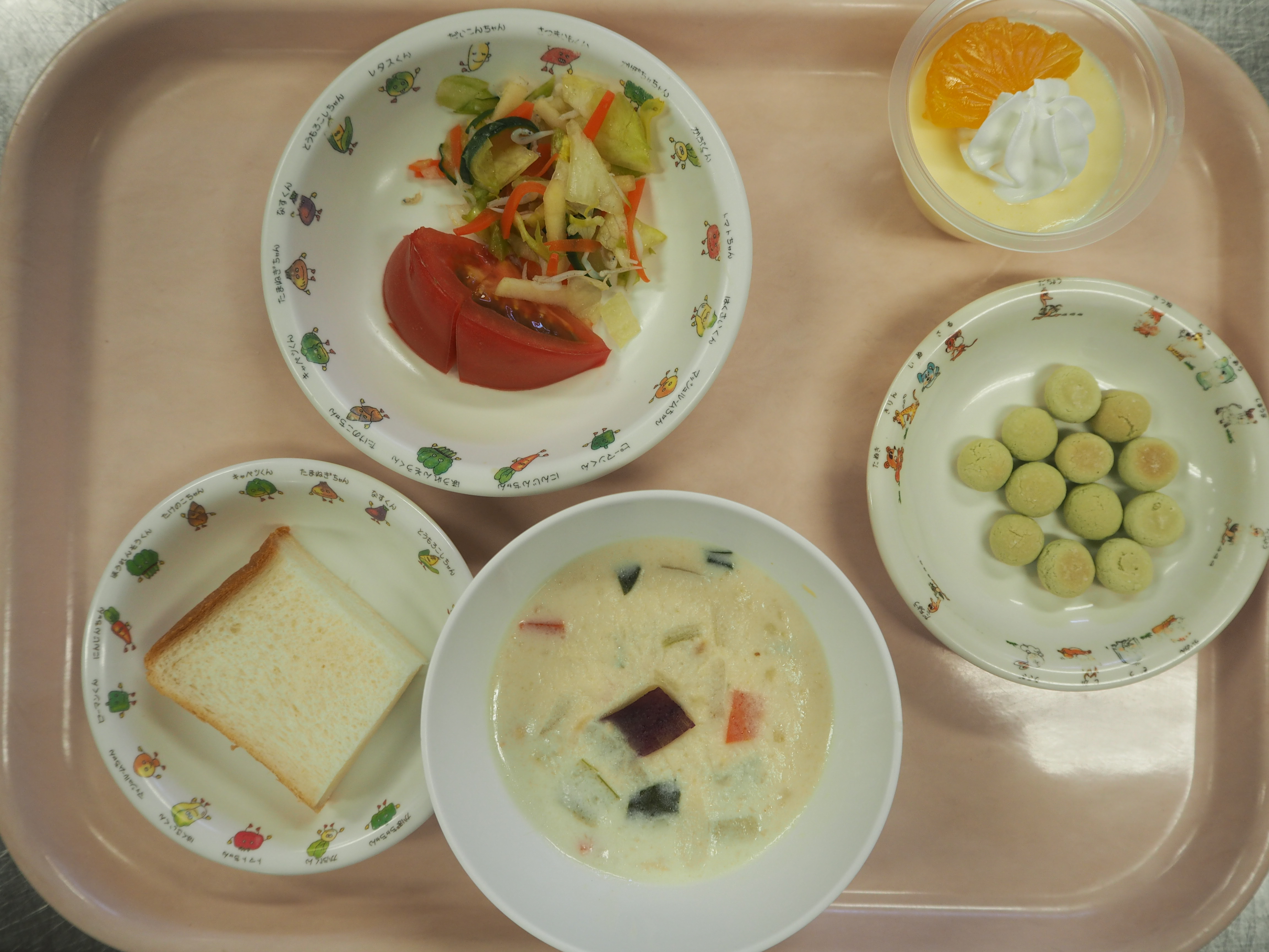 10月17日の献立 ~以上児本日の献立~ ・さつまいもと青菜のクリーム煮 ・ちりじゃこサラダ ・トマト *プリンアラモード(午後のおやつ) ~未満児本日の献立~ ・パン ・さつまいもと青菜のクリーム煮 ・ちりじゃこサラダ ・トマト *ボーロ、お茶 *プリンアラモード(午後のおやつ)~後期食本日の献立~ ・おかゆ ・さつまいものクリーム煮 ・しらすサラダ *バナナヨーグルト ~中期食本日の献立~ ・本日、配食なし