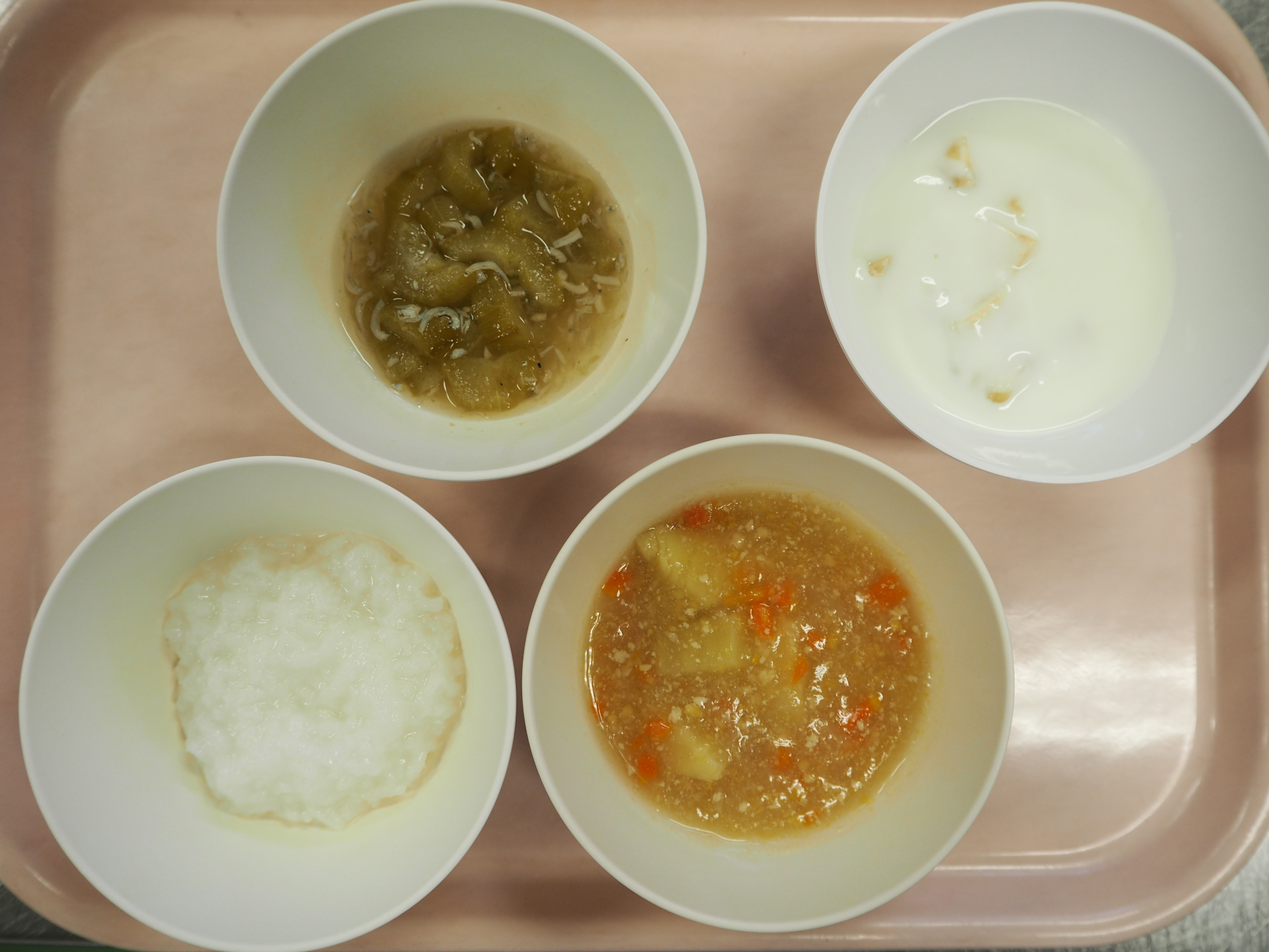 10月15日の献立 ~以上児本日の献立~ ・豆腐ハンバーグ ・フライドポテト ・野菜スープ *フルーツポンチ(午後のおやつ) ~未満児本日の献立~ ・ごはん ・豆腐ハンバーグ ・フライドポテト ・野菜スープ *ヨーグルト、お茶 *フルーツポンチ(午後のおやつ)~後期食本日の献立~ ・おかゆ ・ハンバーグ ・野菜スープ *りんごのコンポート